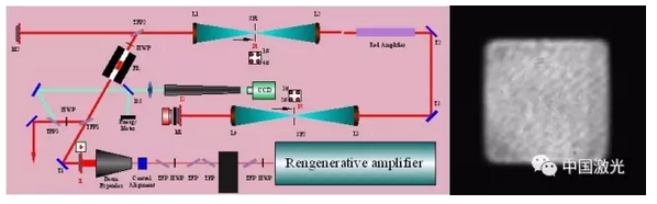 圖 離軸四程放大器的光路示意圖(左圖)和近場分布(右圖)
