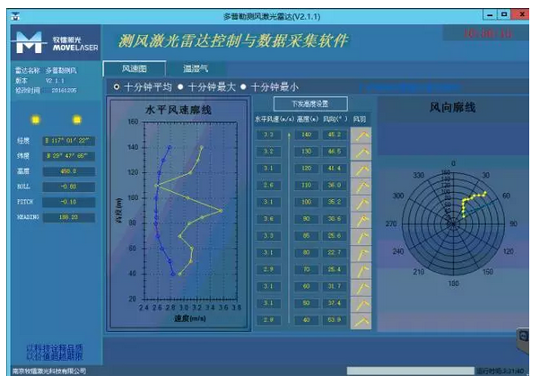 上圖為Molas B300客戶端軟件界面,該界面可實時顯示實測風廓線、風向廓線以及雷達工作狀態、位置信息、方向信息等基本情況,用戶登錄客戶端還可實現測風激光雷達遠程控制,實時下載數據等功能。