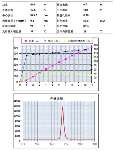 由于采用單管串聯、空間合束的技術路線,在600瓦的輸出條件下,該產品輸出光纖的數值孔徑(90%能量)僅為0.18。通過對芯片與VBG的優化組合,在整個工作電流調節范圍內,該產品均能實現波長鎖定,光譜寬度小于1nm。0.18的輸出NA,使得光纖激光器在合束器熔接點的壓力大幅降低。整個工作電流范圍內的鎖定,保證了在設備啟動和調制過程中,半導體激光器泵浦源的中心波長保持不變,產品也不受環境溫度的影響,為應用帶來了諸多優勢。