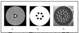 光子晶體光纖采用空氣與石英玻璃復合的材料結構,該結構可以大幅度提高纖芯與包層之間較大的折射率反差,這種結構可以很好地將光波電磁場嚴格限制在光纖芯中。圖1是3種典型的不同結構的FTTH用光子晶體光纖。