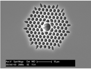 光子晶體光纖的結構與常規光纖迥然不同,普通的光纖是由實體的纖芯和包層構成的,而光子晶體光纖的包層由空氣孔和石英構成,空氣孔在纖芯的外圍以正六邊形的樣子規則排列。石英-空氣復合結構的光子晶體光纖大折射率反差、高度可控制的周期性折射率變化,為光的傳導與控制提供了新的機理及途徑。光子晶體光纖具有許多獨特而神奇的物理特性:可控的非線性、無盡單模特性、可調節的奇異色散、低彎曲損耗、大模場等,這些特性是常規石英單模光纖很難或無法實現的,因此,光子晶體光纖引起了科學工作者的濃厚興趣,并開展了深入的理論與試驗研究。