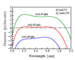 改變光子晶體光纖中的空氣孔大小與間距,光子晶體光纖的色散和色散斜率會急劇變化。如實心光纖的零色散點在1300nm波長附近,也可以通過設計將零色散點向長波長移動,但是難以獲得短波長的零色散。光子晶體光纖就可以實現傳統實心光纖無法實現的短波長零色散特性、寬波段的色散平坦特性(如圖2),以及超大負色散特性。