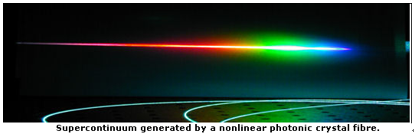 超連續譜(SC)是高功率密度脈沖激光通過非線性介質產生的強烈光譜展寬,利用光脈沖在光子晶體光纖中的自相位調制(SPM)、受激喇曼散射(SRS)以及四波混頻(FWM)等非線性效應,可使輸入脈沖展寬得到超連續譜,在超連續光譜中取出特定波長的激光就可以制造不同波長的新型光源。超連續譜光源在飛秒激光脈沖的相位穩定、光學相干層析(OCT)、超短脈沖壓縮、激光光譜學和傳感技術等領域具有廣泛的應用。