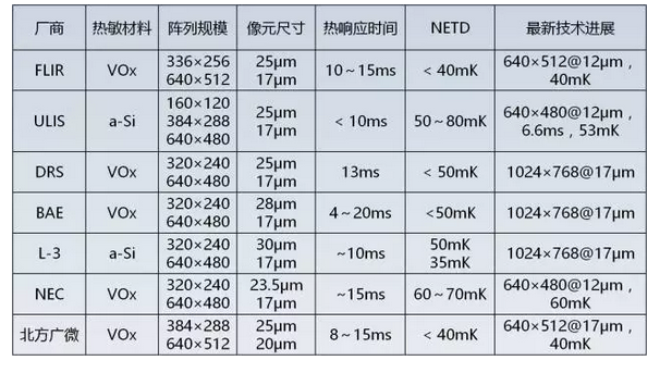 國內外主要廠商的技術對比情況如表所示。從表中可以看出,目前國內外產品的幾項主要技術指標中,熱敏材料、陣列規模、熱響應時間、NETD等基本居于同一水平,在像元尺寸方面國外廠商具有一定領先優勢。