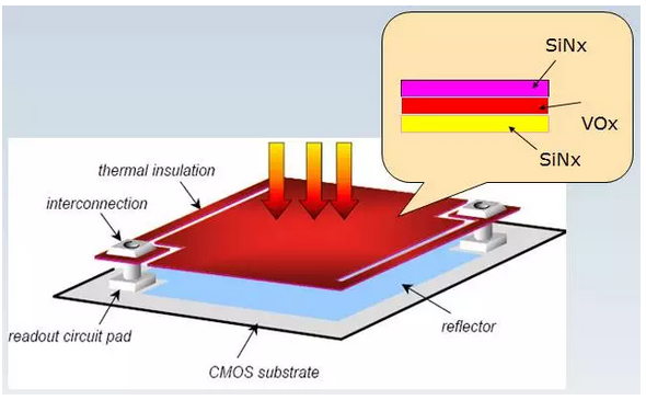 熱敏層材料的選取對于微測輻射熱計的靈敏度(NETD)有非常大的影響,目前最為常用的熱敏材料包括氧化釩(VOx)和多晶硅(a-Si)兩類,相應的非制冷紅外焦平面探測器也據此分成了兩大技術陣營。