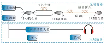太原理工大學新型傳感器與智能控制教育部重點實驗室研制出長距離光纖拾音器(產品實物見圖1),工作原理基于馬赫-澤德爾與薩格奈克干涉原理設計(工作原理見圖2),實現了長距離全向分布式光纖聲音獲取,該儀器的優勢在于: