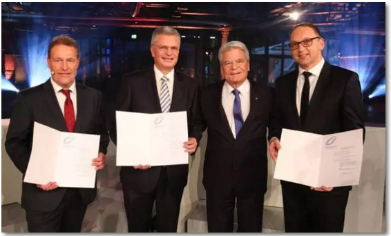 德國前總統(tǒng)高克頒獎,左二為克勞斯艾姆爾曼教授