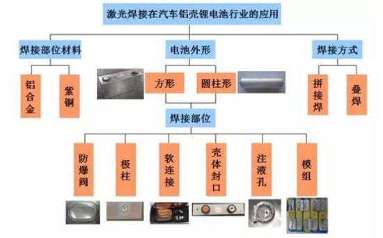 動力電池電芯根據(jù)外形可分為方形、圓柱、軟包電池。方形電池電芯需要焊接的 部位有防爆閥、封口焊、注液孔焊接等,圓柱電池電芯需要焊接的部位有蓋帽極耳、注液孔、封口焊等。除了電芯之外,電池成組PACK焊接也是需要激光焊接的,圓柱電池PACK焊接、方形電池PACK焊接、軟包電池PACK焊接等。