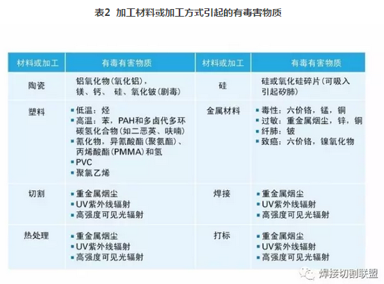 以下是根據(jù)ISO 11553-1 《激光加工設備—通用安全要求》列舉的加工材料或加工方式引起的有毒害物質: