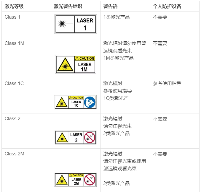 國際電工委員會標準(IEC 60825-1)依據激光產品的波長以及最大輸出激光功率,將激光產品分為了以下7個等級:1、1M、2、2M、3R、3B、4。 其中1M, 2M兩個等級代表產品的安全等級分別和1、2級一致,但在使用如望遠鏡等光學設備時,可能將危害程度放大從而超越1、2級的危害。3級也分為3R和3B兩個子級別。