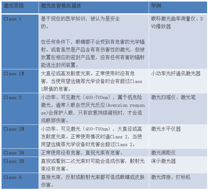 激光產品的波長和功率決定了激光對人體不同組織的傷害。波長決定不同人體組織對激光的吸收特性以及危害的機理,功率和能量則會決定激光危害的程度。國際電工委員會標準依據激光產品的波長、最大輸出激光功率或能量將激光產品分為了幾個大的安全等級,他們就像激光產品的名片一樣,代表了激光產品的危害程度,用戶需要注意的事項。