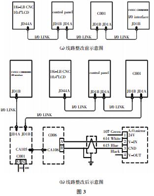 在 FANUC 18i-LB 系統上增加變形鏡穿孔功能需增加一個端子型 I/O 模塊基本模塊和擴展模塊 E,具體的線路整改詳見圖 3。