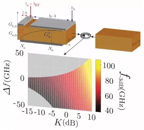 圖: 光注入增益杠桿半導體激光器的調制帶寬表現。上圖:激光器結構示意圖。包含一個短的調制部分和一個長的增益部分的增益杠桿激光器與外部主激光器耦合在一起。下圖:處于光注入增益杠桿激光器的穩定鎖定區域的3 dB調制帶寬,增益杠桿激光器兩個部分的損耗率比g=10,增益壓縮因子ε = 10−16 cm3。
