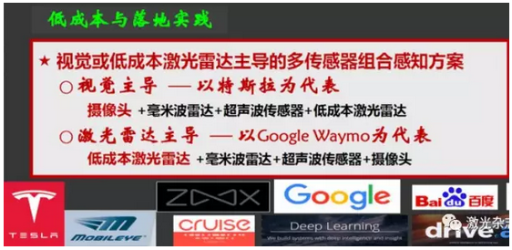據清華大學鄧志東教授介紹,自動駕駛環境感知的技術路線主要有兩種:一種是以特斯拉為代表的視覺主導的多傳感器融合方案,另一種以低成本激光雷達為主導,典型代表如谷歌Waymo。