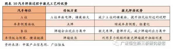 汽車輕量化持續帶動對激光焊接的需求。減輕汽車重量,不僅可以降低油耗、減少二氧化碳排放,而且可以改善加速性能、縮短制動距離、最終提升駕駛體驗。因此,汽車輕量化已經成為國內外汽車制造商追求的一個新的目標。實現汽車輕量化,最有效的方式是使用輕質材料;相比于傳統材料,目前可用的汽車輕質化材料有鋁合金、碳纖維、鎂合金等,而這些材料加工較普通鋼材難度更大,通常采用激光焊接的方式進行處理,可以在加工效率和性能之間找到平衡;此外,板材的激光拼焊,能減少板材的搭接部分,進而減輕一部分的重量。激光焊接作為一種先進的加工技術,未來將成為汽車制造業的標配工具,需求也將受到汽車輕量化的發展而不斷增長。