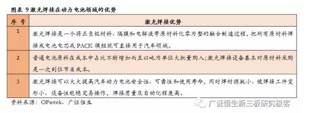 動力電池出貨量持續增長,帶動激光焊接需求。近年來新能源汽車出現爆發式增長,產量由2012年的1.25萬輛增長至2016年的51.7萬輛,作為新能源汽車核心零部件的動力電池,其發展緊隨新能源汽車整體市場趨勢,動力電池市場也呈現爆發趨勢,資本等的大量涌入帶動了動力電池出貨量的大幅提升。而激光焊接技術能做到全融合、全對比、全工藝等效果,所以越來越多應用于動力電池制造。動力電池的焊接部位主要有:頂蓋、底蓋和側面的焊接,頂蓋防爆片及安全蓋的焊接,密封釘的焊接以及電芯機耳與頂蓋的焊接等,激光焊接需求巨大。