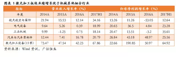 我們在31家新三板激光公司中挑選出激光加工相關的15家,這些公司主要分布在激光產業鏈中上游,主要業務為上游激光元器件和中游激光器的生產,我們對這15家公司進行分析后發現,其營業收入2014-2016年平均同比增速54.41%,在2017上半年延續67.86%高速增長,凈利潤同比增長64.92%,靚麗業績驗證激光加工行業上半年高景氣度,我們認為未來激光加工設備的兩個核心驅動力為傳統工藝的替代和下游新興應用的需求拉動,激光加工行業的高景氣度有望中長期延續。