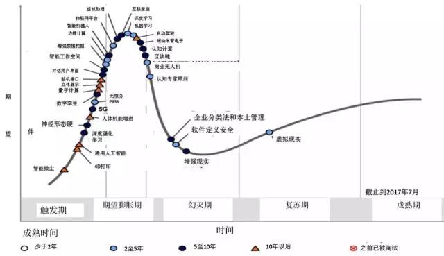 不久前,信息技術研究公司Gartner發布了2017年度“新興技術成熟度曲線”(The Hype Cycle),這是用來評估新科技可見度的一種工具, 也是技術企業投資決策的重要風向標。