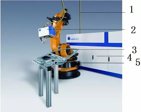 圖3 激光飛行焊基本組成結構,1.光釬 2.PFO 3.機器人 4.激光器 5.焊接件