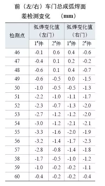 我公司某高端轎車車型在車門調試階段,對車門窗框部位的弧焊工藝焊后變形問題花費了近半年時間攻關。弧焊后車門變形量最大達到3mm,前門窗框總成50%~70%的部位弧焊變形量超過0.7mm以上(見圖1及附表),而后車門總成達到了80%~90%部位弧焊變形。在進行項目調試時需要花費較大的人力物力才把該問題控制在可接受范圍。