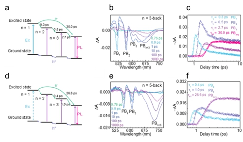 準二維n=3(a,b,c)和n=5(d,e,f)鈣鈦礦薄膜材料反面激發瞬態吸收光譜
