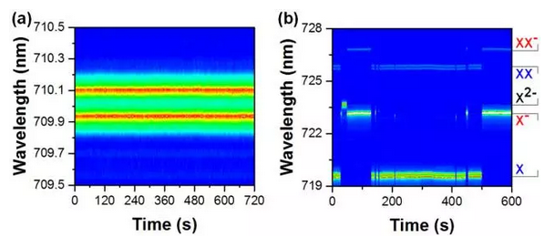 (a)低功率下單個鈣鈦礦納米晶的中性單激子雙峰劈裂發(fā)射;(b)高功率下單個鈣鈦礦納米晶的中性單激子X、單電單激子X-、雙電單激子X2-、中性雙激子XX和單電雙激子XX-的熒光發(fā)射譜線。以上時間依賴熒光發(fā)射測量的實驗溫度為4 K。