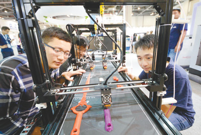2017中國增材制造大會暨展覽會7月在杭州國際博覽中心舉行。圖為觀眾參觀一臺生產型3D打印機。