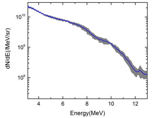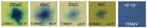 在國家重大儀器專項(xiàng)、重大科學(xué)問題導(dǎo)向項(xiàng)目(973A))、XXX專項(xiàng)和協(xié)同創(chuàng)新等項(xiàng)目的支持下,顏學(xué)慶教授、陳佳洱院士領(lǐng)導(dǎo)的北京大學(xué)激光加速器團(tuán)隊(duì)攻克了高對比度與高光強(qiáng)激光技術(shù)、自支撐納米薄膜靶制備技術(shù)、超高流強(qiáng)離子束傳輸技術(shù)和激光加速器輻照研究平臺等關(guān)鍵技術(shù),最終建成世界上首臺超小型激光加速器輻照裝置(如圖1所示),加速參數(shù)指標(biāo)為1~15 MeV質(zhì)子束,總流強(qiáng)106-8個(gè)粒子/發(fā)。2017年激光加速器裝置正式建成出束,并通過了同行專家的現(xiàn)場技術(shù)測試。實(shí)驗(yàn)中利用能譜儀、RCF和CR39,確認(rèn)加速產(chǎn)生了能量1-15 MeV 質(zhì)子束(如圖2所示),在加速穩(wěn)定性測試實(shí)驗(yàn)中,進(jìn)行了5發(fā)連打測試,顯示質(zhì)子截止能量的穩(wěn)定性好于3%(如圖3所示)。