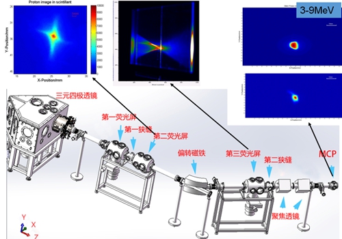 激光加速直接產(chǎn)生的質(zhì)子束通常具有較大的能散,束流能量和流強(qiáng)的穩(wěn)定性和可靠性可以通過基于電磁鐵束流傳輸系統(tǒng)進(jìn)一步改進(jìn),從而提供日常運(yùn)行所需要的可靠性、穩(wěn)定性和重復(fù)性。北京大學(xué)首次采用了基于電四極透鏡和分析磁鐵等高流強(qiáng)離子束流傳輸和分析系統(tǒng),并開展了3-10 MeV能量可調(diào)的高流強(qiáng)、短脈沖質(zhì)子束傳輸測試,穩(wěn)定地獲得了1%能散/1-10pC電量的質(zhì)子束(均為國際最好指標(biāo))。