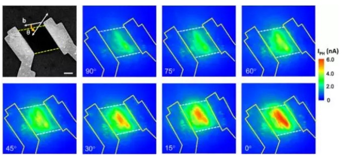 同年,斯坦福大學袁洪濤和崔屹等人將一塊黑磷薄片制作成上下垂直pn結(jié),有效分離光生載流子,如圖3所示,同時制作一個環(huán)狀電極,消除電極/黑磷邊緣對偏振探測的干擾。結(jié)果顯示黑磷具有明顯的偏振光敏感性。