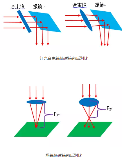 功率越高或標刻高反材料,光學元件受熱膨脹越迅速,熱透鏡越明顯。改善熱透鏡,可以在激光器、場鏡和紅光合束鏡片三方面著手:
