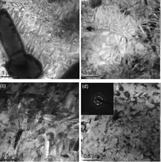 (a) 基體; (b) 高密度位錯; (c) 位錯胞; (d) 表層納米晶