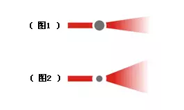 光在行進中遇到微小顆粒時,會發(fā)生散射。大顆粒的散射角較小(如圖1),小顆粒的散射角較大(如圖2)。儀器能接收的散射角越大,則儀器的測量下限就越低。
