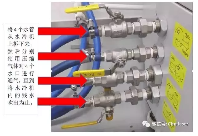 5. 最后將激光器和冷水機外部其它的水管管路里的水也排放干凈。