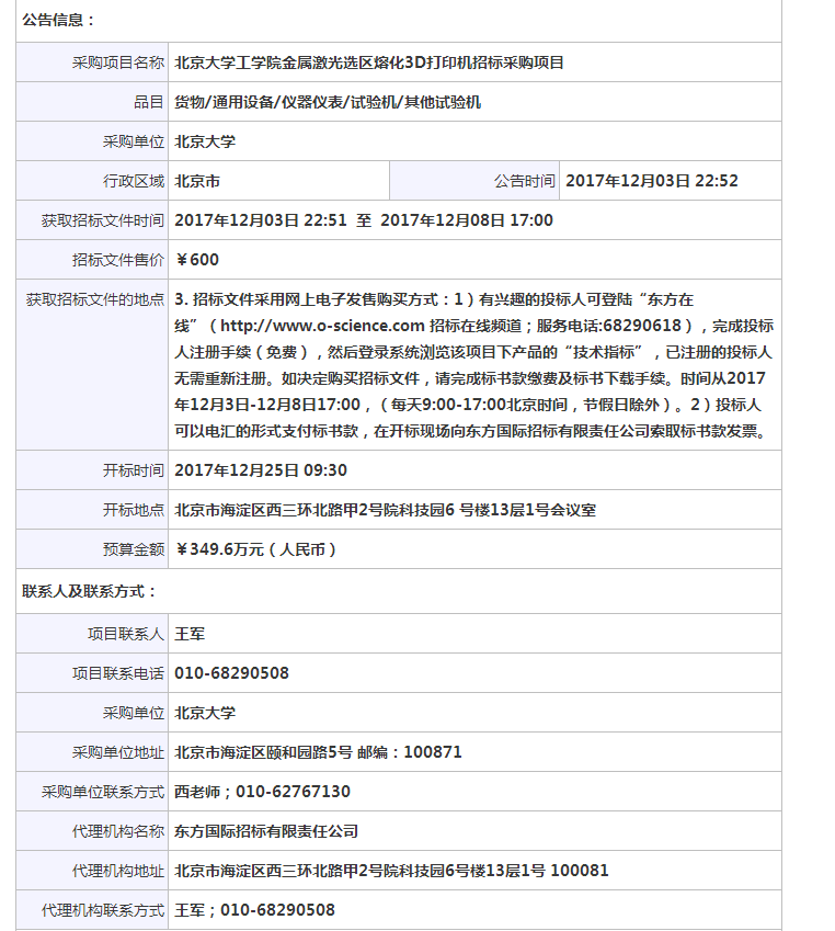 北京大學工學院金屬激光選區熔化3D打印機招標采購項目公開招標公告: