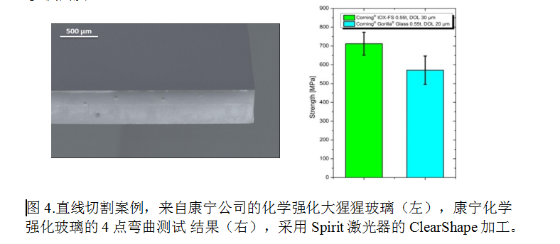 例如,切割康寧的厚度為0.55毫米化學強化大猩猩玻璃,應力層深度(DOL)為20μm,速度可達4米/秒。除了切削自由邊緣,使用ClearShape工藝實現(xiàn)了激光切割(由截面的平均粗糙度定義)<0.1μm的質(zhì)量(見圖四,左)。非常高的切割質(zhì)量使在玻璃的四點彎曲試驗期間達到了700MPa的極高的彎曲強度,而無須任何后處理步驟(圖4,右)。