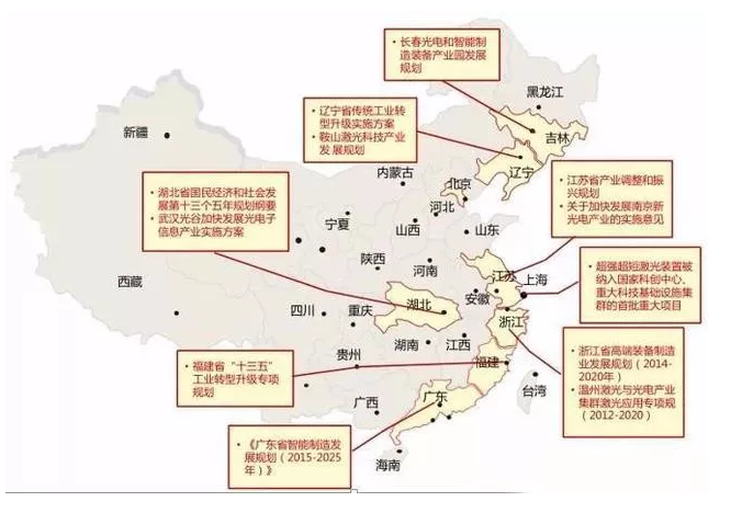 目前,中國激光產業主要有4個產業帶,分別是珠江三角洲、長江三角洲、華中地區和環渤海地區。這些產業帶原本側重點有所不同,隨著相關政策的發布,國內多省市地區也把光電子和激光產業作為地方規劃發展的重點方向,國內激光產業的區域格局正在發生改變。