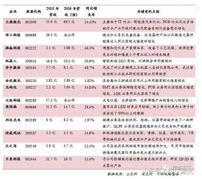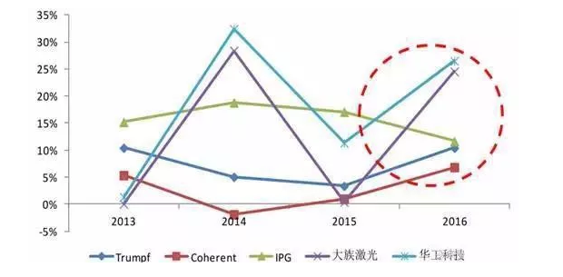 事實上,中國激光市場增長速度已經超過了歐美等國。2016年,中國激光企業龍頭大族激光與華工科技的增長率分別為26.50%、24.55%,收入增長均高于國外企業。