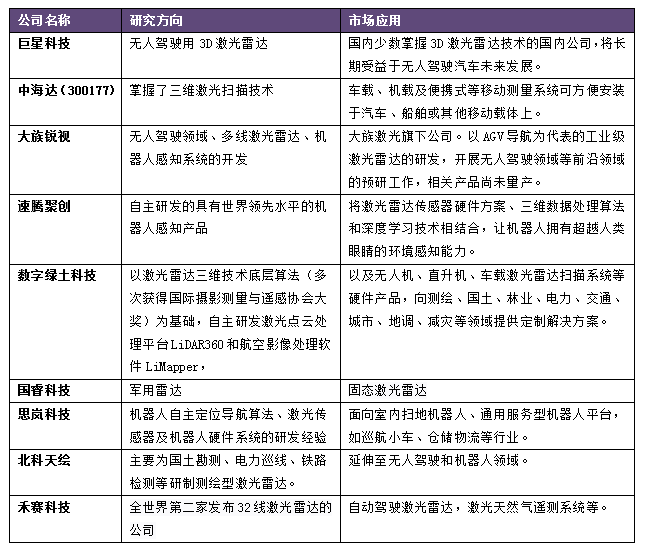 激光雷達技術有著這么廣闊的應用市場,致使國內(nèi)眾多企業(yè)紛紛涉足其中。國內(nèi)主要激光雷達廠商(如下表格)。