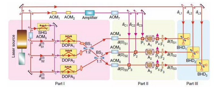 圖1 實驗裝置。Part I:三組份光學糾纏的產生系統;Part II:光場糾纏到原子系綜的映射系統;Part III:糾纏驗證系統