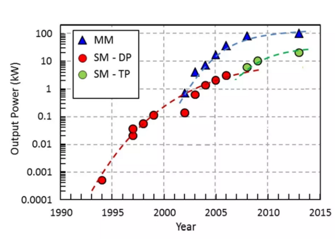 圖 高功率包層抽運(yùn)的摻Y(jié)b3+光纖激光器的功率提升。圖中同時(shí)涵蓋了多模光纖激光器(MM),二極管直接抽運(yùn)(SM-DP)激光器和同帶級(jí)聯(lián)抽運(yùn)(SM-TP)的激光器功率提升情況。