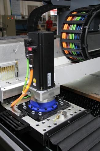 高動態(tài)機床的設(shè)計和最新控制軟件的開發(fā)與應(yīng)用。研制高剛性、高強度、輕質(zhì)移動功能部件,經(jīng)有限元FEM算法,采用三角形桁架穩(wěn)定結(jié)構(gòu),超高壓拉制航空用鋁合金材料,高速移動橫梁的靜態(tài)和動態(tài)的應(yīng)力、應(yīng)變有大幅提升,輔以高響應(yīng)、高精度一體化雙邊同步伺服驅(qū)動配置(圖3),整體傳動鏈的動態(tài)加速度高達3g。