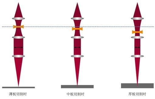 通常來說,激光切割必須先有起刀孔,尤其是切割厚板材料時,穿孔質(zhì)量十分重要,優(yōu)良的穿孔是保證光束和氣流穩(wěn)定的基礎(chǔ),對萬瓦級激光切割而言,變焦穿孔技術(shù)是通過伺服電機控制擴束鏡組與聚焦鏡的相對距離,實現(xiàn)聚焦光斑正負離焦量的變化,切割不銹鋼、鋁及鋁合金、黃銅及紫銅需要負離焦,厚度越大,負離焦越深(圖1)。采用伺服控制“雙凸—雙凹—雙凸”ZOOM鏡組,實現(xiàn)分級或無級調(diào)焦(圖2),高速動態(tài)變焦穿孔,實現(xiàn)割縫斷面無斜度切割。采用光束整形技術(shù)、模式自動變換控制技術(shù)、能量密度微積分技術(shù),實現(xiàn)大厚度不銹鋼及高反射材料的“亮面切割”。