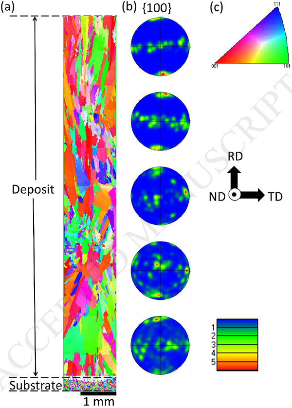 (a) 從基材到沉積試樣頂部沿高度方向區域的反極圖(IPF)著色的OIM圖;