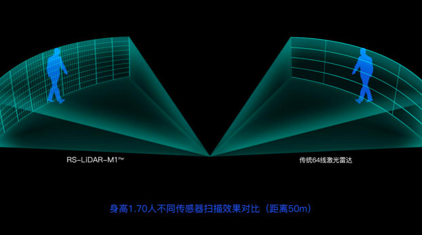 RS-LiDAR-M1 Pre 的角分辨率為 0.09 ° *0.2 ° 。據(jù)了解,這也是目前已知全球范圍內(nèi)已發(fā)布 MEMS 激光雷達(dá)中最小的角分辨率。賦予了 RS-LiDAR-M1 Pre 洞察分毫的探測(cè)能力,對(duì)于 50 米外一個(gè) 1.70 米高的人,16-beam 的傳統(tǒng)激光雷達(dá)檢測(cè)出的是一條線,64-beam 檢測(cè)出的是 5 條線,而 RS-LiDAR-M1 Pre,則可以檢測(cè)到 10 條線。