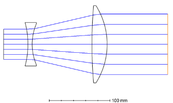 這意味著這款擴束鏡的鏡片口徑將達到120毫米左右,這給設計帶來了一些困難。首先想到的是使用3片鏡片來完成這款設計,經過初始結構的選擇,分析優化,最后的結果總是不理想。由于光束直徑太大,設計出的結構出現鏡片很厚,或者鏡片的彎曲很大,或者系統很長的問題。
