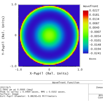 后來經過繼續調節參數和優化函數,最后達到了要求。但是系統的長度較長,且由于個別鏡片的彎曲較大,使用彎月鏡來平衡系統的像差。彎月鏡的加工難度是比較大的,增加了生產成本。