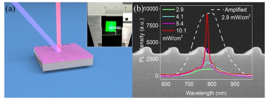 (a)DFB全硅激光器的光泵浦和發光示意圖;插圖:DFB激光器件的實物照片。(b)樣品的PL譜隨泵浦功率的變化;背景:DFB結構的橫截面SEM圖像。