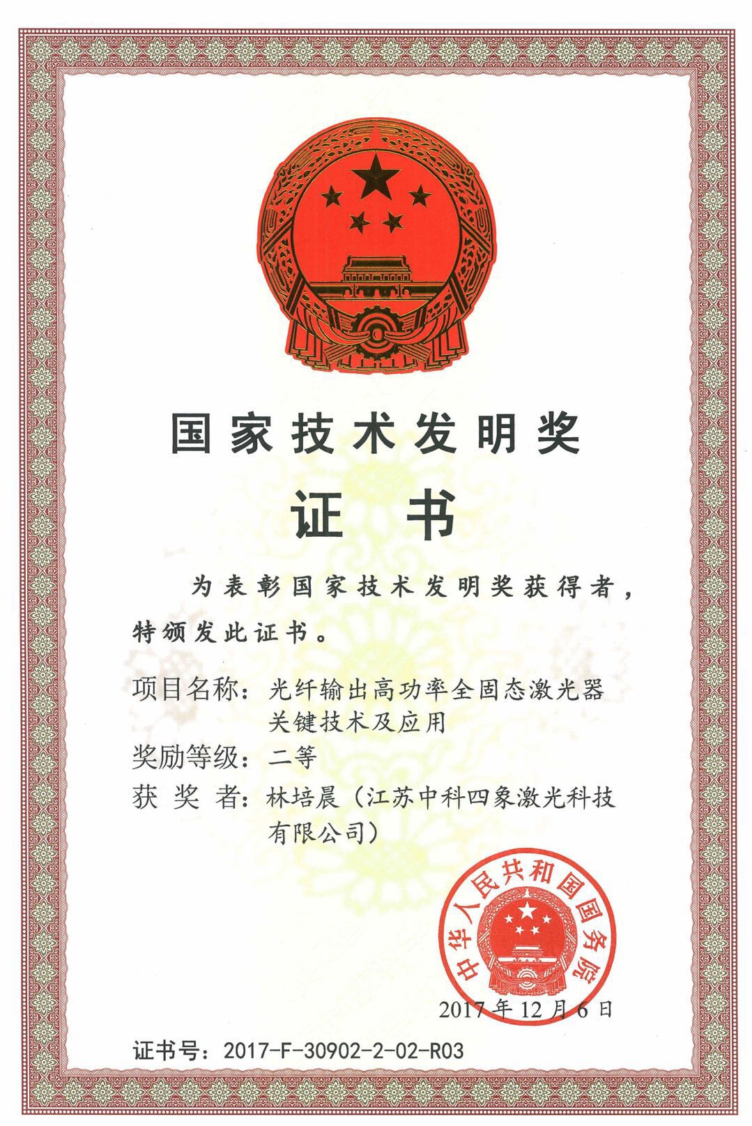 會上,以中科院半導體所研究員、江蘇中科四象激光科技有限公司首席專家林學春研究員及江蘇中科四象激光科技有限公司總經理林培晨為發明人代表的“光纖輸出高功率全固態激光器關鍵技術及應用” 項目榮獲國家技術發明獎二等獎。