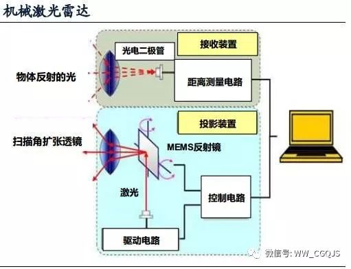 機械激光雷達由光電二極管、MEMS反射鏡、激光發射接受裝置等組成,其中機械旋轉部件是指圖中可360°控制激光發射角度的MEMS發射鏡。